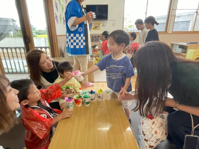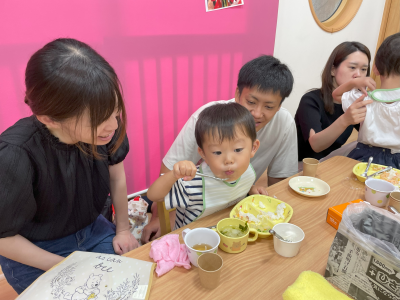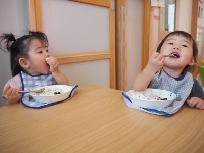 たくさん遊んだ後は一緒に給食。モリモリ食べるぞ~